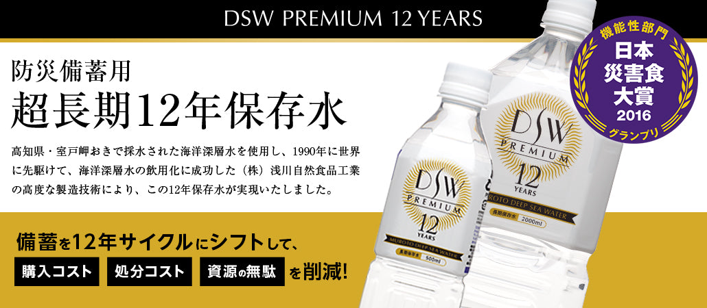 高知県・室戸岬おきで採水された海洋深層水を使用し、1990年に世界に先駆けて、海洋深層水の飲用化に(株)浅川自然食品工業の高度な製造技術により、この12年保存水が実現いたしました。